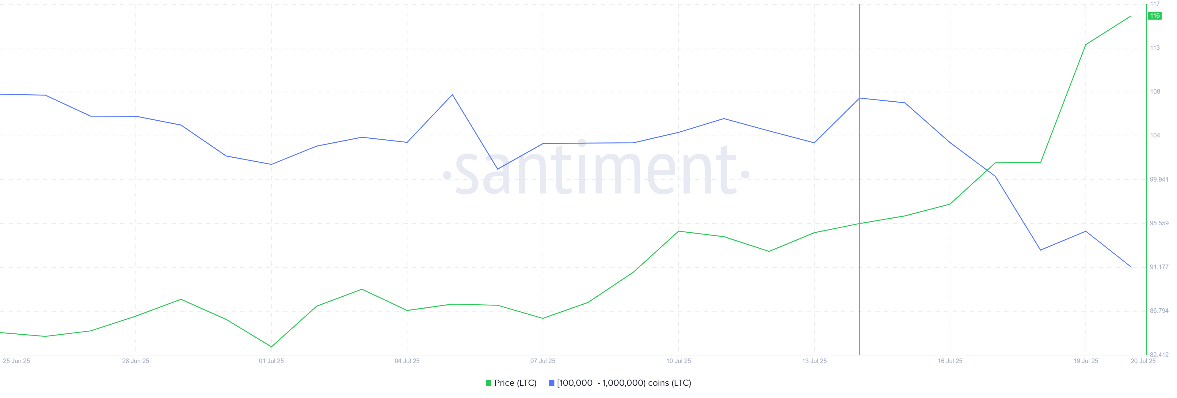 Son beş günde, 100.000 ile 1 milyon LTC arasında tutan balina cüzdanları 500.000’den fazla coin sattı. Bu büyük satış, yaklaşık 58 milyon Dolara eşdeğer ve büyük yatırımcılar arasında temkinli bir duyguya işaret ediyor. Bu eylemleri, mevcut rallinin uzun ömürlülüğünden şüphe duyduklarını gösteriyor.
