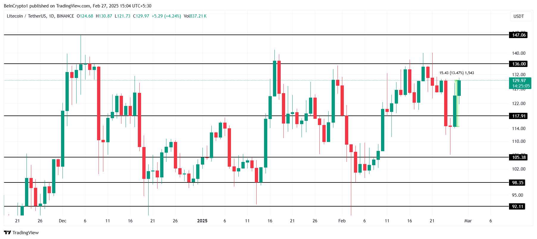 Şu anda, Litecoin’in fiyatı 129 Dolar seviyesinde ve son 24 saatte %13 artış gösteriyor. Bu artış, altcoin’i son üç aydır aşmakta zorlandığı 136 Dolar’daki kritik dirence yaklaştırdı. Mevcut fiyat hareketi, Litecoin’in yeni bir yükseliş denemesi yapabileceğini gösteriyor, ancak önceki başarısızlıklara neden olan faktörler hala geçerli.