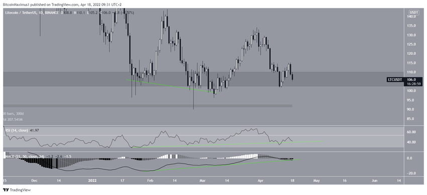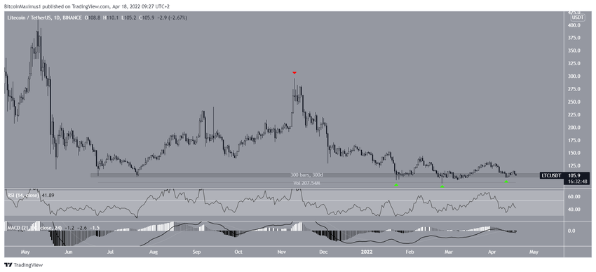 Günlük grafik, olumsuz bir tablo ortaya koyuyor. Fiyat hareketine bakıldığında, 2021 yılı Kasım ayında başlayan düşüşün hala devam ettiği görülüyor (kırmızı ok). Ayrıca Litecoin, 105 dolar bölgesine bir kez daha temas etti. 105 dolar bölgesi ise 300 gündür bir destek olarak çalışıyor.
