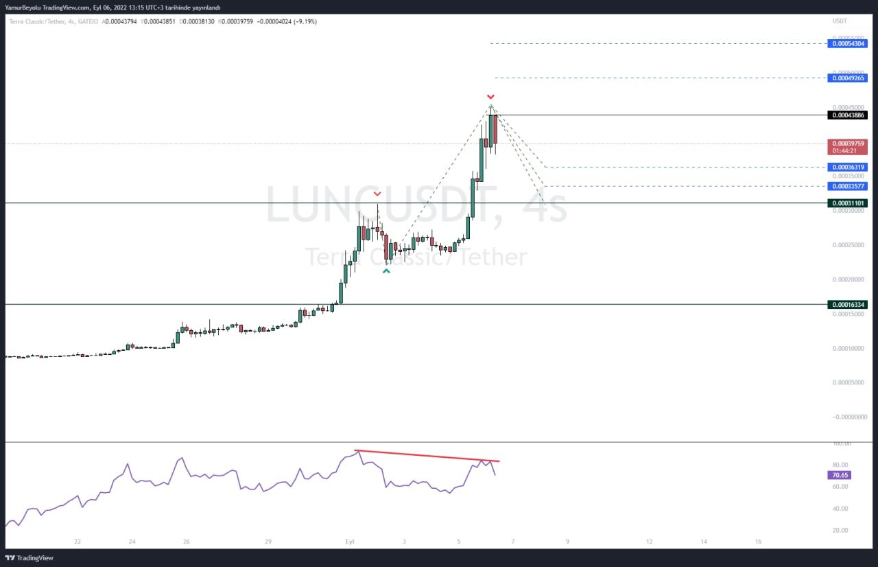 Tüm bunların ardından BeInCrypto Türkiye analistlerinden Yağmur Bayoğlu ise popüler altcoin için kritik destek ve direnç seviyelerini yatırımcılar için paylaştı. Bayoğlu, LUNC Coin için teknik göstergelerde şu an negatif uyumsuzluk oluştuğuna dikkat çekerken, olası geri çekilmelerde 0,00031 dolar desteğinin önemli olacağını belirtti: