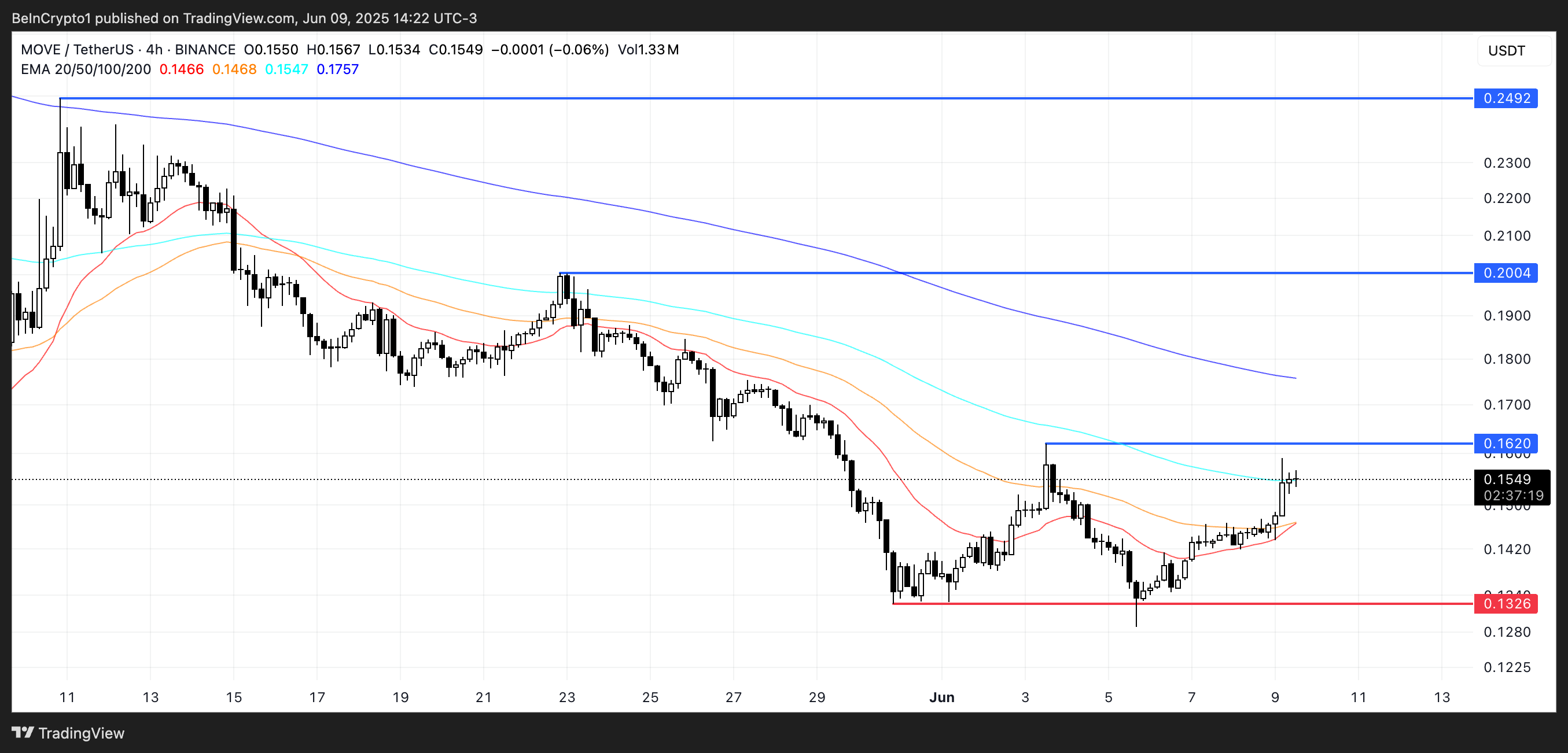 Teknik olarak, EMA çizgileri yakında bir altın kesişim oluşabileceğini ve potansiyel olarak yükseliş kırılmasını tetikleyebileceğini gösteriyor. Eğer momentum artarsa, MOVE $0,162, $0,20 ve muhtemelen $0,249 gibi önemli direnç seviyelerini test edebilir.