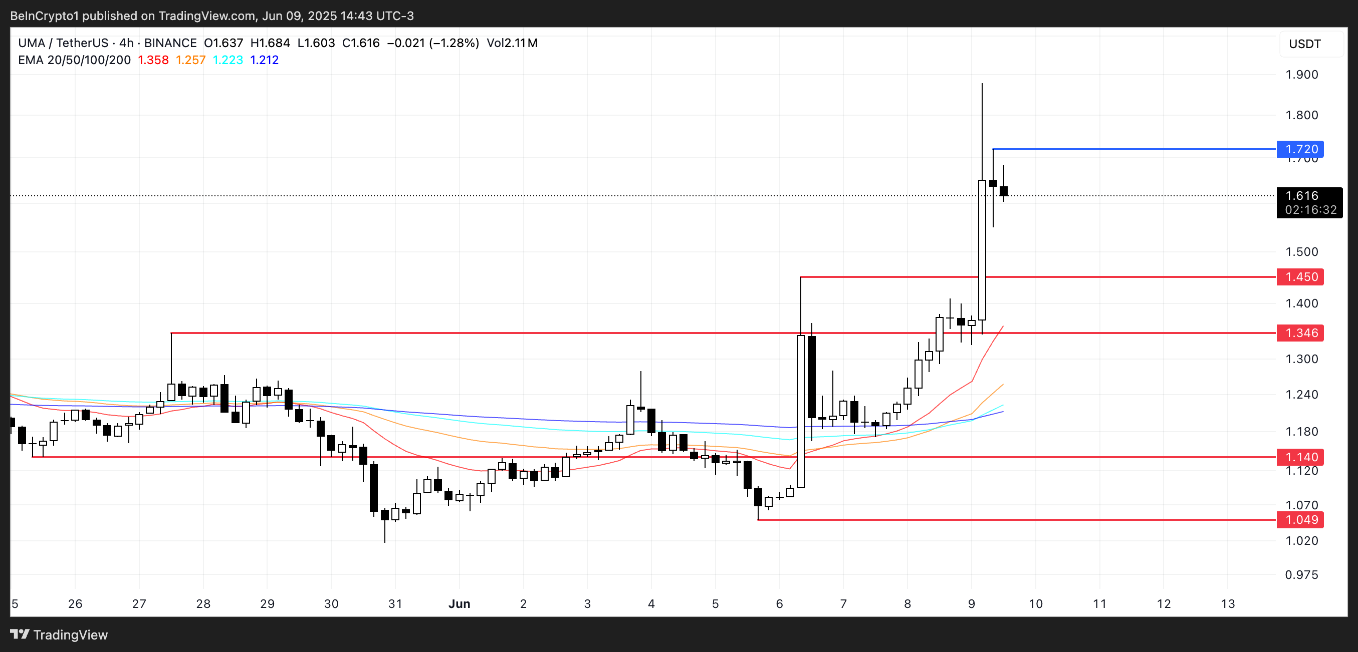 Heyecan artarken, token son 24 saatte %24 ve geçen hafta %44,5 arttı. Eğer momentum devam ederse, UMA yakın vadede $1,72 civarındaki direnci test edebilir.