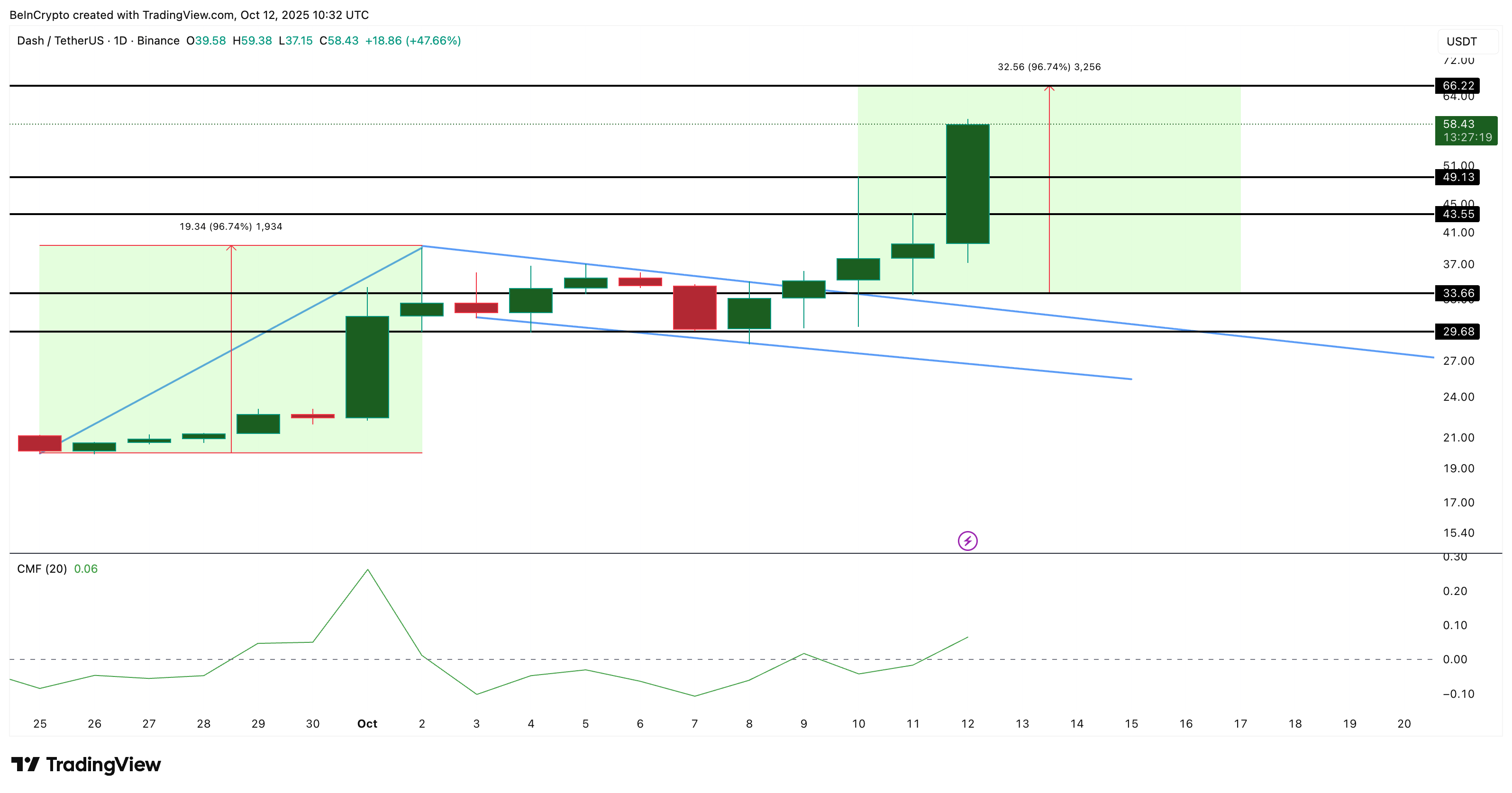 Kırılma 33 Dolar civarında başladı ve o zamandan beri keskin bir yükseliş sağladı, DASH fiyatı son 24 saatte %36 ve son bir haftada %62’den fazla arttı.