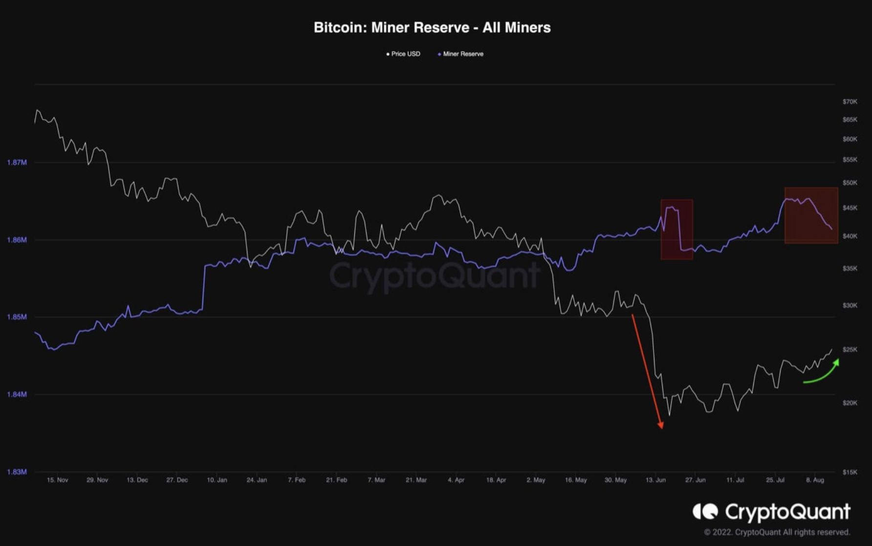 “Madenciler, Bitcoin’in 16.000 dolara düştüğü Haziran 2022’de en büyük miktardaki BTC satışını yaptılar. Düşen karlılık nedeniyle çok endişeliydiler. Bununla birlikte, piyasanın 18.000 dolar ile 22.000 dolar seviyeleri arasındaki son konsolidasyon aşamasında, Madenci Rezervi yavaş yavaş artıyordu. Bu madenciler, kayıpları karşılamak ve fiyat istikrarsızlıklarına maruz kalmalarını azaltmak için Bitcoin’lerini satmak zorunda kaldılar.