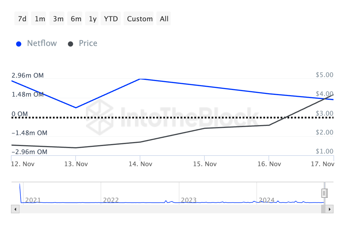 OM’un büyük sahiplerinin net akışı son birkaç günde düştü. IntoTheBlock verilerine göre, 14 Kasım ile 17 Kasım arasında %54 azaldı. Bu, balina birikiminin azaldığını ve altcoin’in fiyatına aşağı yönlü baskı yapabileceğini gösteriyor.