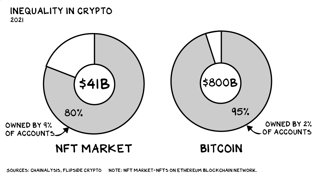 Galloway’a göre gücün birkaç kişinin elinden alınarak topluluklara dağıtılması üzerine kampanyalar yürütülen Web 3.0, kendi merkeziyetçiliğini yaratıyor. Verilere göre Ethereum blok zinciri üzerindeki NFT’lerin, piyasa değerinin %80’i, %9’luk bir azınlığın elinde bulunuyor. Whitelist uygulamaları, ekosistem içerisindeki kârlılığı yine zengin bir azınlığa yöneltiyor. Merkezi finans sistemlerine tepki olarak doğan lider kripto para birimi Bitcoin’in arzının %95’i sadece %2’lik bir topluluğun elinde bulunuyor. Bitcoin madencilerinin %0,1’i, tüm madencilik üretiminin yarısından sorumlu. Galloway’e göre Bitcoin bir ülke olsaydı eşitsizliğin en yüksek olduğu topraklardan birisi olurdu.