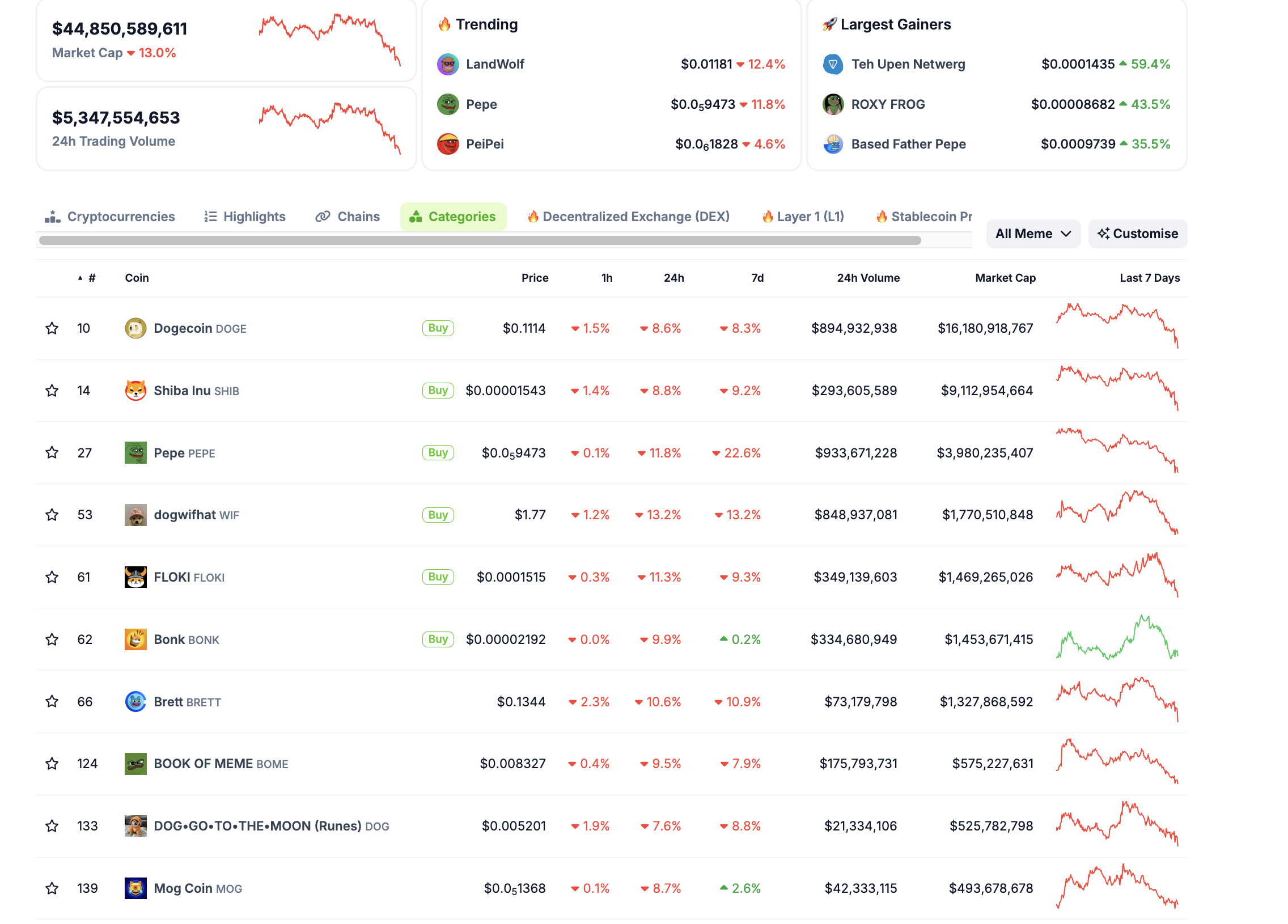 Şu anda, meme coin sektörü son 24 saatte yaklaşık yüzde 13 düştü. İlk 10 meme coin arasında en büyük düşüşü yüzde 13,2 ile WIF yaşadı.