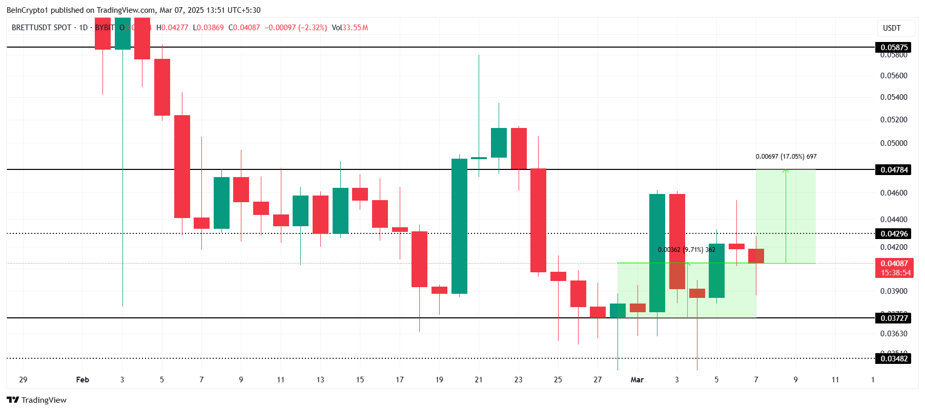 0,0478 Dolar seviyesini başarıyla desteğe çevirmek, BRETT’in 0,0500 Dolar seviyesinin üzerine çıkmasını ve büyümesini sağlayabilir.