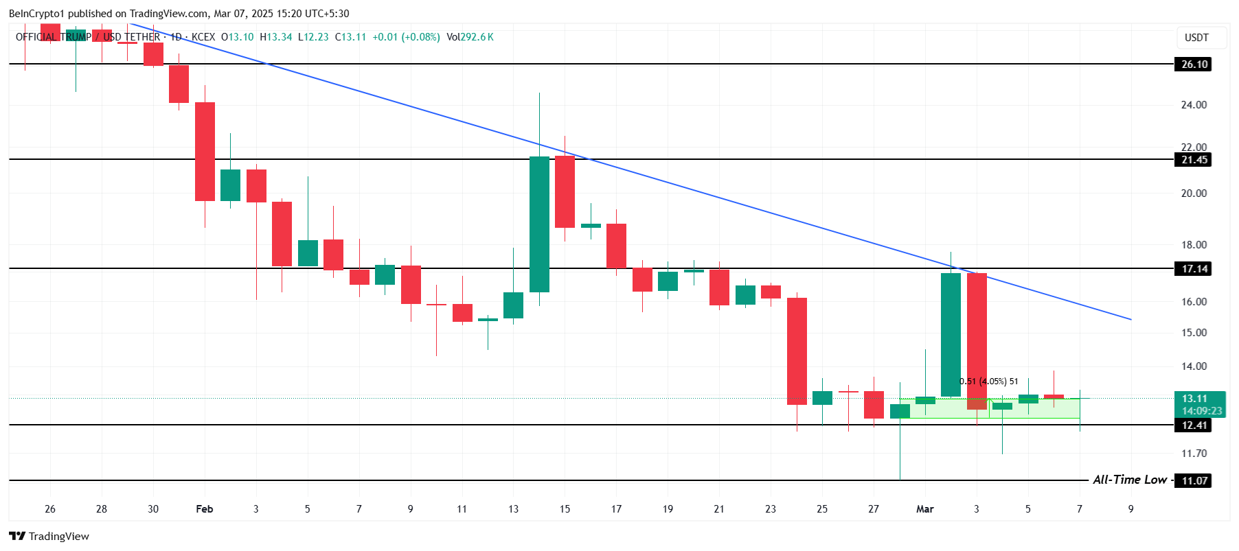 TRUMP başlangıçta bu hafta 13,11 Dolar seviyesine yükseldi. Ancak Cuma günü 12,28 seviyesine düşen meme coin, 12,10 Dolar ile kritik destek seviyesinin üzerinde kalmayı başardı. Bu da daha geniş piyasa dalgalanmaları arasında istikrarlı bir trend’i işaret ediyor.