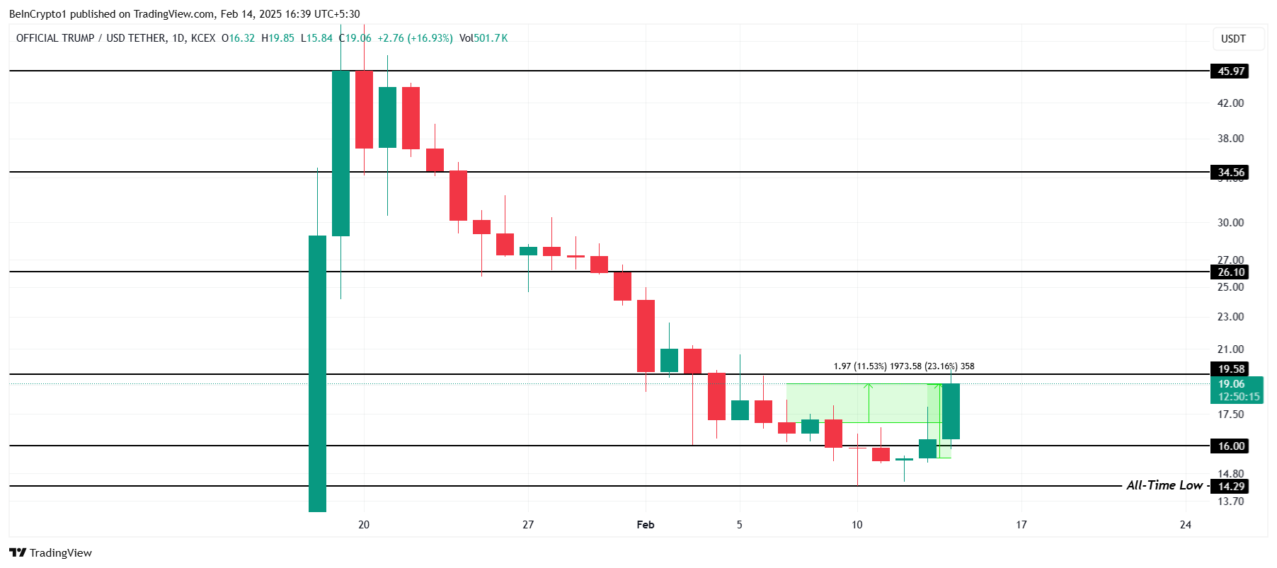 Eğer TRUMP 19,58 Dolar bariyerini aşamazsa, bu direnç seviyesinin altında bir fiyat durgunluğu yaşayabilir. Altcoin, 16,00 Dolar desteğine geri çekilebilir veya tüm zamanların en düşük seviyesi olan 14,29 Dolar’ı test edebilir. Bu senaryo, yükseliş görünümünü geçersiz kılar ve kayıpları uzatarak potansiyel toparlanmayı geciktirir.
