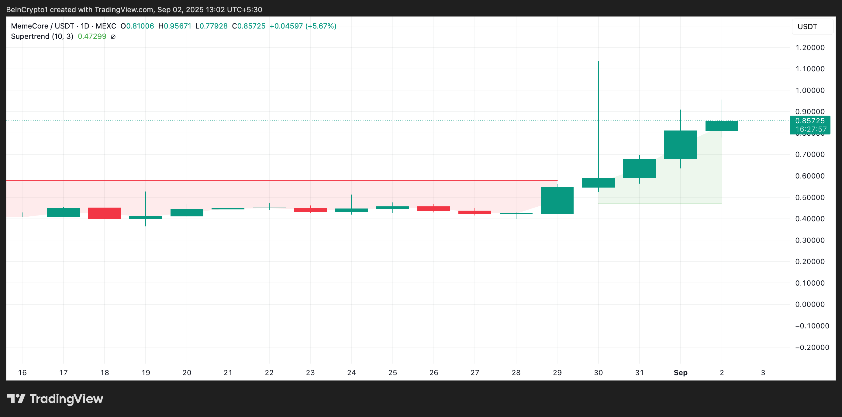 MemeCore (M) son 24 saatte neredeyse %40 artış göstererek bugün piyasanın en çok kazananı oldu. Katman 1 (L1) coin’i şu anda 0,87 Dolar seviyesinden işlem görüyor.