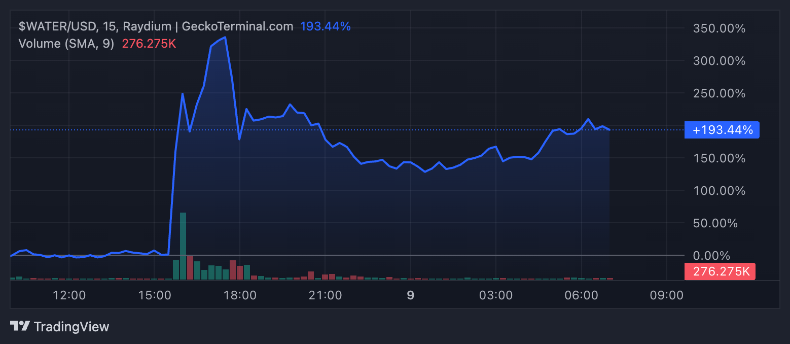 GeckoTerminal verilerine göre, WATER meme coin hala yaklaşık yüzde 193 oranında artmış durumda. Ancak, Pazartesi günkü zirvesinden yaklaşık yüzde 41 oranında düşmüş bulunuyor.