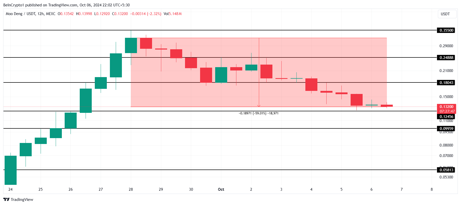 Moo Deng’in fiyatı, son yedi gün içinde neredeyse yüzde 60 düşerek şu anda 0,132 dolar seviyesinde işlem görüyor. Şimdilik, meme coin 0,124 dolarlık kritik destek seviyesinin üzerinde tutunmayı başarıyor. Ancak söz konusu istikrar uzun sürmeyebilir.