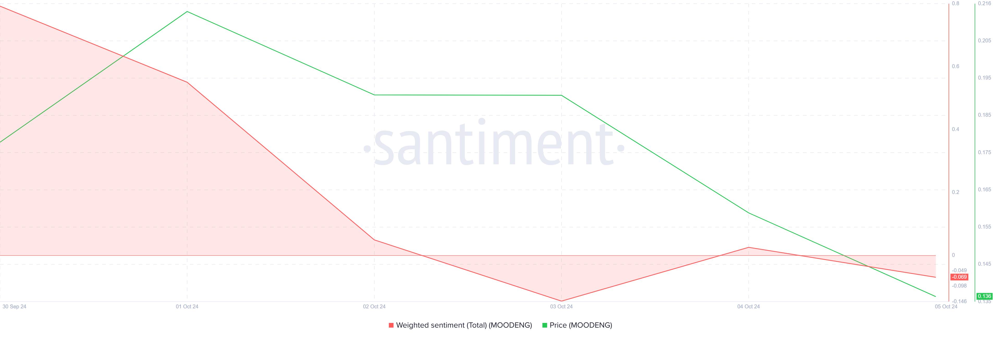 Moo Deng için piyasa hissiyatı keskin bir şekilde değişti. 0,355 dolarlık tüm zamanların en yüksek seviyesine ulaştıktan sonra, yatırımcıların iyimserliği hızla solgunlaştı. Genel yatırımcı ruh halini ölçen ağırlıklı hissiyat negatife döndü. Token’ın toparlanmasına olan güvenin azaldığını işaret ediyor.