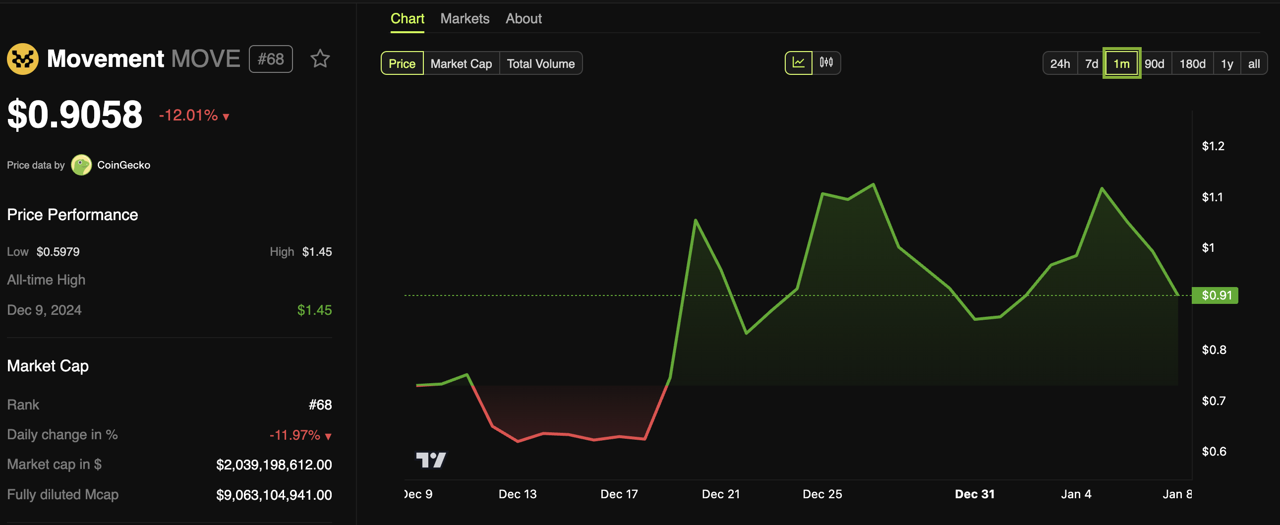 Aralık ayının başlarında piyasaya sürülmesinden bu yana, MOVE kaotik fiyat hareketleri yaşadı. Varlığın değeri, piyasaya sürüldükten birkaç gün sonra hızla yükseldi, ancak o zamandan beri çok kısa sürede vahşi dalgalanmalar yaşadı. Yine de, Movement Labs bunun gelecekteki gelişmelerde önemli bir rol oynayacağını belirtti.