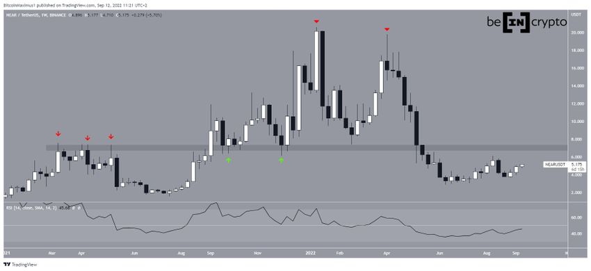 Haftalık grafik, NEAR Coin’in Nisan 2022’de düşük tepe oluşturduktan sonra (kırmızı simgeler) düşüşe geçtiğini gösteriyor. Bu aşağı yönlü hareket sonucunda Haziran’da 2,87 dolara kadar gerileme yaşandı. Daha da önemlisi fiyat, 7 dolar yatay destek bölgesinden kırılım gerçekleştirdi. Bu bölge, 2021’den bu yana hem direnç (kırmızı simgeler), hem de destek (yeşil simgeler) görevi gördüğünden dolayı çok önemli. Trendin boğaların lehine dönmesi için fiyat, bu bölgeyi tekrar ele geçirmeli.