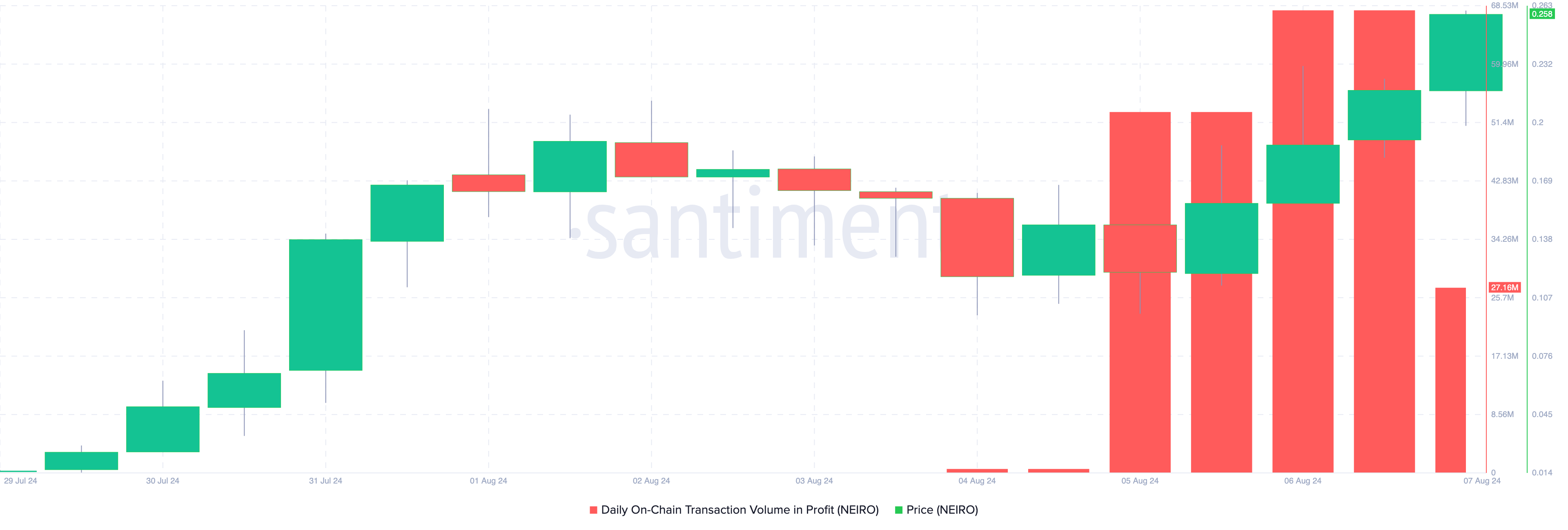 NEIRO için, bugün itibariyle kârdaki günlük zincir içi işlem hacmi son dört günden daha düşük. NEIRO’nun fiyatı artan kar rezervasyonunun olumsuz etkisini hissetmeyebilir.