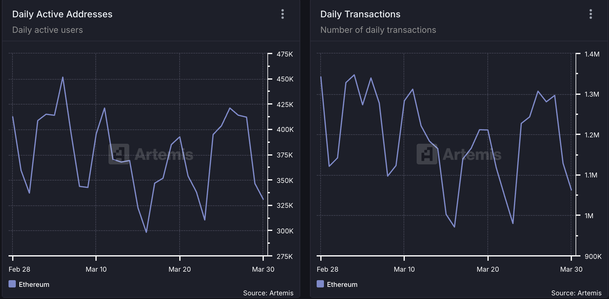 ETH’nin fiyat sorunları arasında, Ethereum ağı da mart ayında ciddi bir aktivite düşüşü yaşadı. Artemis’e göre, en az bir ETH işlemi tamamlayan aktif adreslerin günlük sayısı mart ayında %20 azaldı.