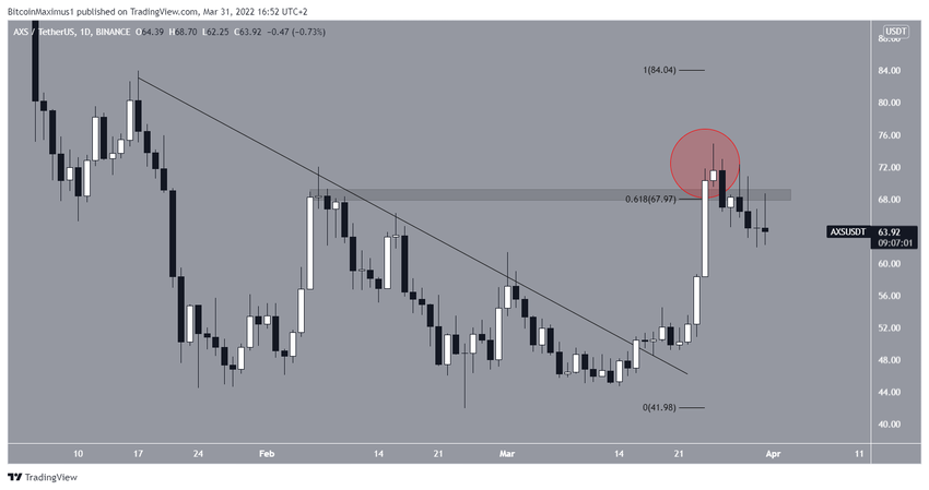 Fiyat grafiğine bakıldığında ise AXS’ın 16 Mart’ta alçalan direnç çizginden çıkış gerçekleştirdiği ancak 68 dolar bölgesini aşamadığı (kırmızı daire) görülüyor. Buna ek olarak altcoin, şu anda bir destek bulmayı deniyor.