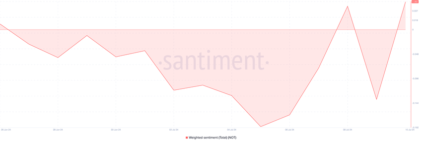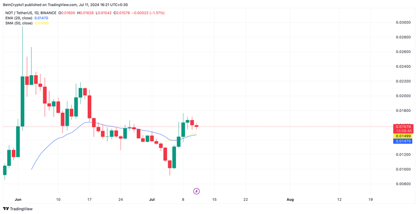 Telegram tabanlı oyun Notcoin’e güç veren token olan NOT, 6 Temmuz’dan bu yana fiyatında bir artış gördü. Haber yayına hazırlanırken 0,016 dolardan işlem gören altcoin’in fiyatı, o zamandan beri yüzde 60 arttı.