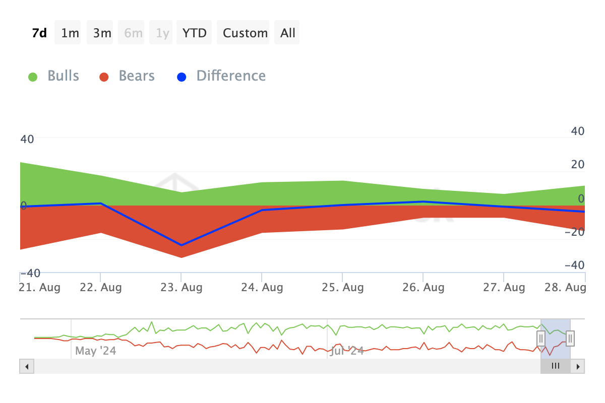 Zincir üstü verilere göre, IntoTheBlock’un Boğalar ve Ayılar göstergesi, katılımcıların çoğunlukla satış yaptığını gösteriyor. Bu gösterge, toplam işlem hacminin en az yüzde 1’ini satın alanların (boğalar) fiyatı yükseltip yükseltmediğini veya satanların (ayılar) fiyatı düşürüp düşürmediğini izler.