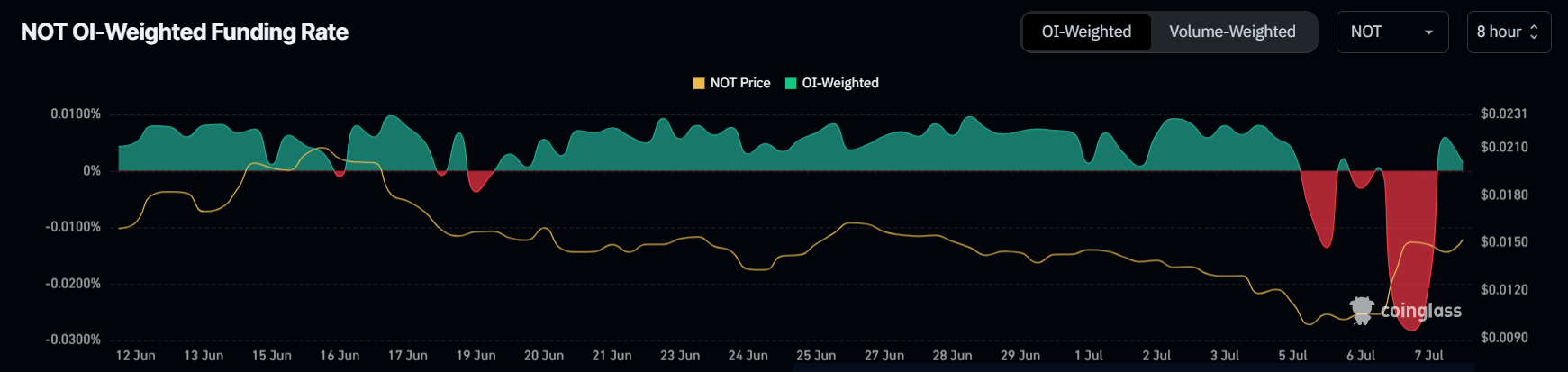 Pozitif RSI’ye ek olarak, Notcoin’in fonlama oranı da pozitife döndü. Bu değişim, daha önce ayı eğiliminde olan yoğun negatif fonlama oranlarının ardından önemli bir sinyal.