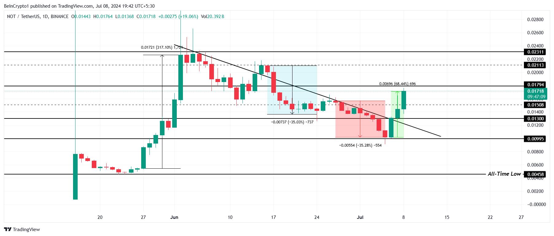Notcoin fiyatı son üç gün içinde yüzde 68 oranında artarak, Haziran ayının sonunda kaydedilen yüzde 35’lik kayıpları telafi etti. Altcoinin şu anki hedefi, 0,0179 dolardaki direncin aşılmasıyla 0,0211 dolar seviyesine ulaşmak.