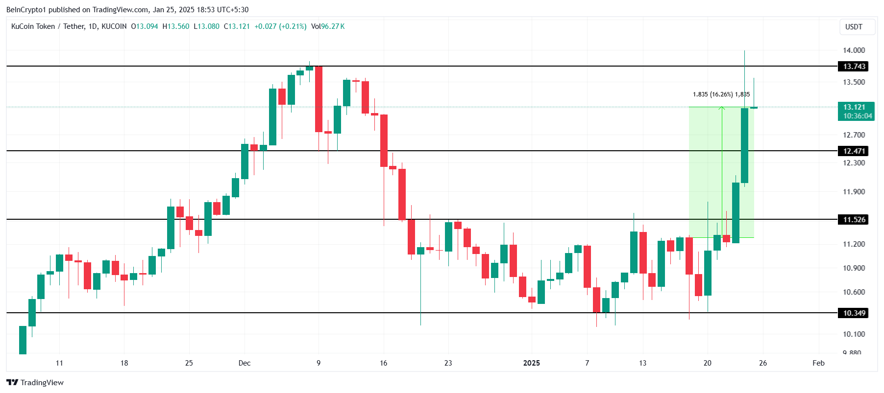 Altcoin, 12,47 Dolar’da sağlam bir destek oluşturduktan sonra 13,74 Dolar direnç seviyesini aştı. Yükseliş ivmesi devam ederse, KCS bu engelin üzerinde kapanış yapabilir ve daha fazla kazanç için yolu açabilir.