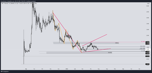 “Alttaki eğik destek (pembe) ve 1.30 ve 1.37 dolar destek bant aralığında alıcıların bu bölgede tutunup baskın olması durumunda, tekrardan 0.5 fib. seviyesine denk gelen 1,53 dolar direnci ve daha sonrasında 1,79 dolar bölgelerine hareket görülebilir. Dikkat edilmesi gereken alt destek seviyeleri olarak ise 0,96 dolar ve 1,12 dolar seviyeleri önemli olacaktır.” RainDrop Crypto – Yağmur Bayoğlu