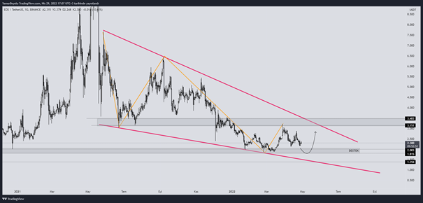 Sponsored Sponsored“EOS, düşen bir trend yapısından sonra daralan üçgen yapısı içerisinde dalga hareketlerine ve fiyatlanmaya devam etmekte. Popüler altcoin için daha önce birçok defa test etmiş ve tepki almış olduğu 1,8 ve 2 dolar seviyelerinin alıcı baskınlığı açısından önemli bir destek alanı olarak görülüyor. “ RainDrop Crypto – Yağmur Bayoğlu