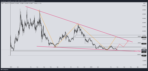 “Düşen üçgen formasyonu içerisinde alt taban bölgesinde fiyat destek bulmaya devam ediyor. Hem eğik destek trendin alt bölgesi hem de talep bölgesi olan ve daha önce fiyatın bu bölgeden tepki alarak yükselişini yaptığı 0,00708 dolar seviyesinden tekrar tepki alması durumunda, yukarı yönde hareketlenebilir. Bu harekette ilk direnç seviyesi olarak 0,0108 dolar, daha sonrasında bu direnç kanalını kırıp üzerinde bir yükselen dip daha yapması ile 0,015 dolar bölgeleri takip edilebilir. “
