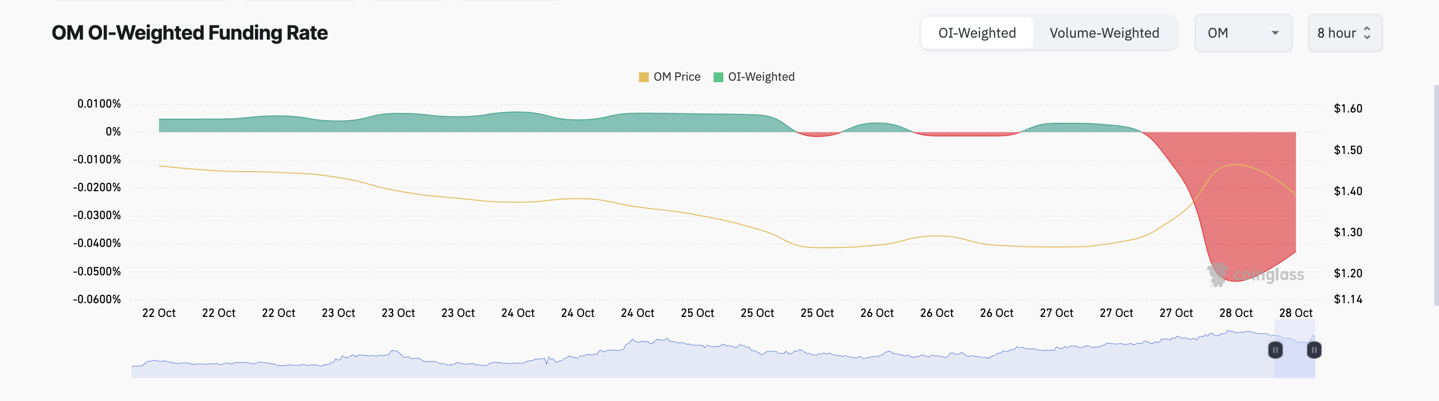 Yine de, OM’un vadeli işlem trader’ları bu boğa hissiyatını paylaşmıyor. Fiyat rallisi başladığından beri, kripto paranın olumsuz fonlama oranlarına bakıldığında, kısa pozisyonlar için talepte bir artış görülüyor. Yazım sırasında bu oran -%0,042 olarak belirlendi.