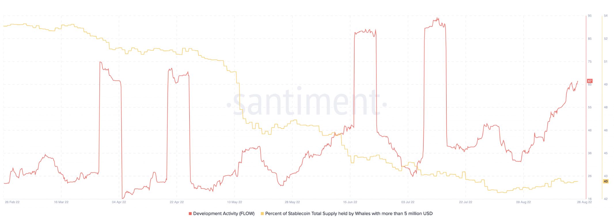 Santiment’e göre, entegrasyonun ardından geliştiriciler için olumlu bir trend tetiklendi. Gelen veriler geliştirici aktivetesinin kuvvetli bir artış başlattığını gösterdi. Öte yandan CelerNetwork gelişmesinin ardından, balinaların toplam arzının 5 milyon dolar seviyesinde yatay bir seyir izlemeye devam ettiği görüldü. FLOW coin şu anda tüm zamanların en yüksek seviyesinden (ATH) %94,9 uzakta işlem görmesine rağmen temel tarafta önemli bir gelişme sağladı.