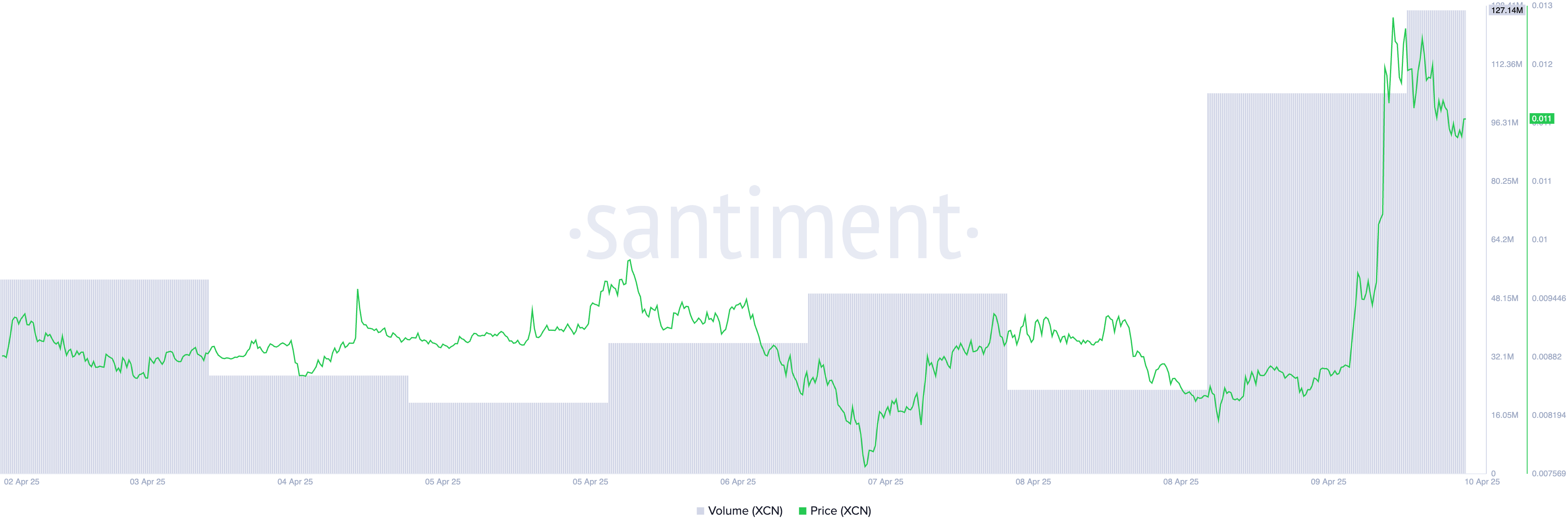 XCN’nin çift haneli rallisi, günlük trading hacmindeki artışla birlikte geldi. Bu, haberin yazıldığı sırada 128 milyon Dolar’a ulaştı ve son gün içinde %480 arttı.