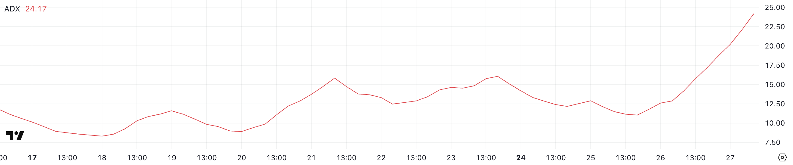 Onyxcoin Average Directional Index (ADX) değeri, bir gün önceki 12,86’dan 24,17’ye yükselerek trend gücünde hızlı bir artış olduğunu gösteriyor.