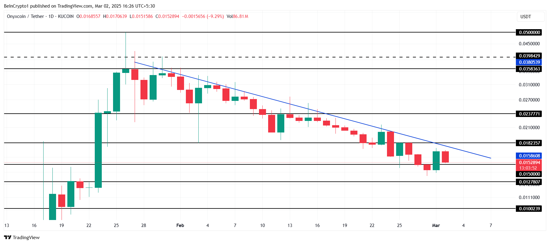 Yazı yazıldığı sırada, Onyxcoin’in fiyatı 0,0152 Dolar seviyesinde ve altcoin son bir aydır trend çizgisinin altında sıkışmış durumda. Bu düşüş trendinden çıkmak için yapılan birçok denemeye rağmen, XCN henüz başarılı olamadı. 0,0150 Dolar’daki direnç, önemli fiyat artışlarına engel oluşturarak sağlam duruyor.