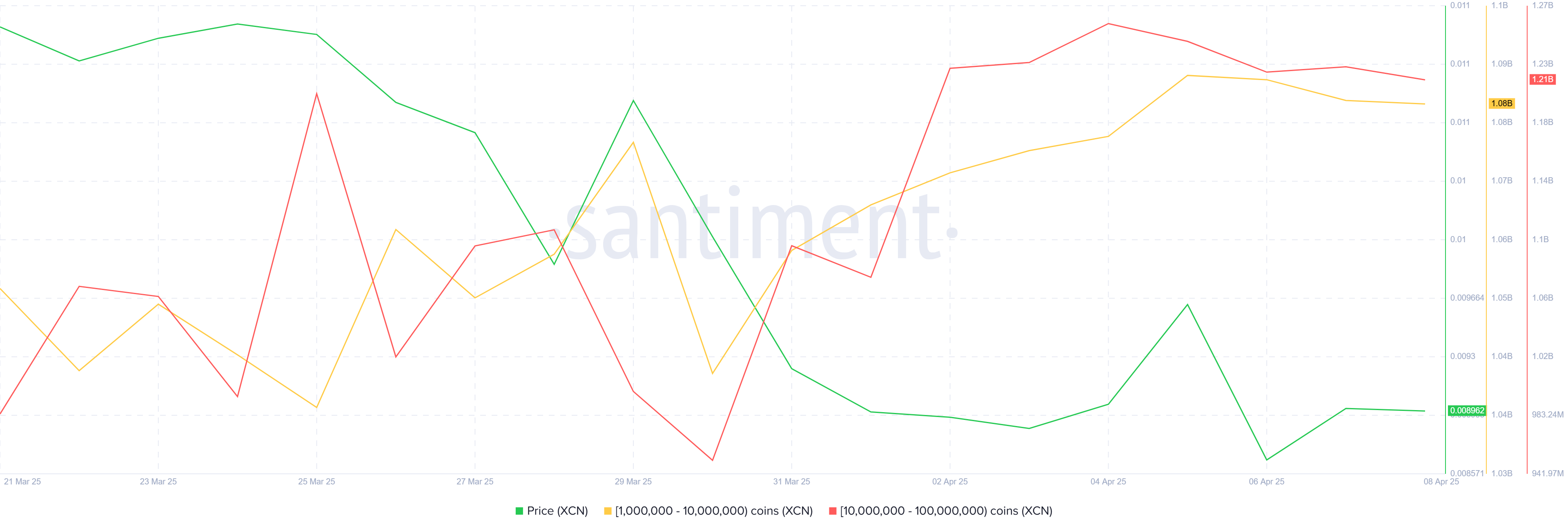 XCN şu anda 0,0089 Dolar’dan işlem görüyor ve geçen hafta boyunca 0,0100 Dolar ile 0,0083 Dolar arasında dar bir aralıkta kaldı. Bu fiyat durgunluğunun, piyasa koşulları iyileşmedikçe devam etmesi muhtemel. Altcoin’in fiyat hareketi, olumlu piyasa momentumunun eksikliği nedeniyle büyük ölçüde sınırlı kalıyor ve ani bir atılımı engelliyor.