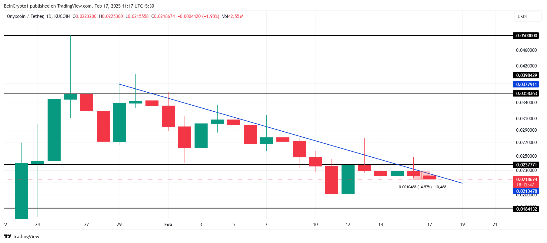 Onyxcoin’in daha geniş makro ivmesi de düşüş eğiliminde, bu durum Göreceli Güç Endeksi (RSI) gibi teknik göstergelerle belirtiliyor. RSI, son beş gündür nötr 50,0 çizgisinin altında sıkışmış durumda ve bu da düşüş eğiliminin devam ettiğini gösteriyor. Nötr çizginin üzerindeki ivme eksikliği, altcoin’in daha fazla aşağı yönlü baskıyla karşı karşıya olduğunu gösteriyor.