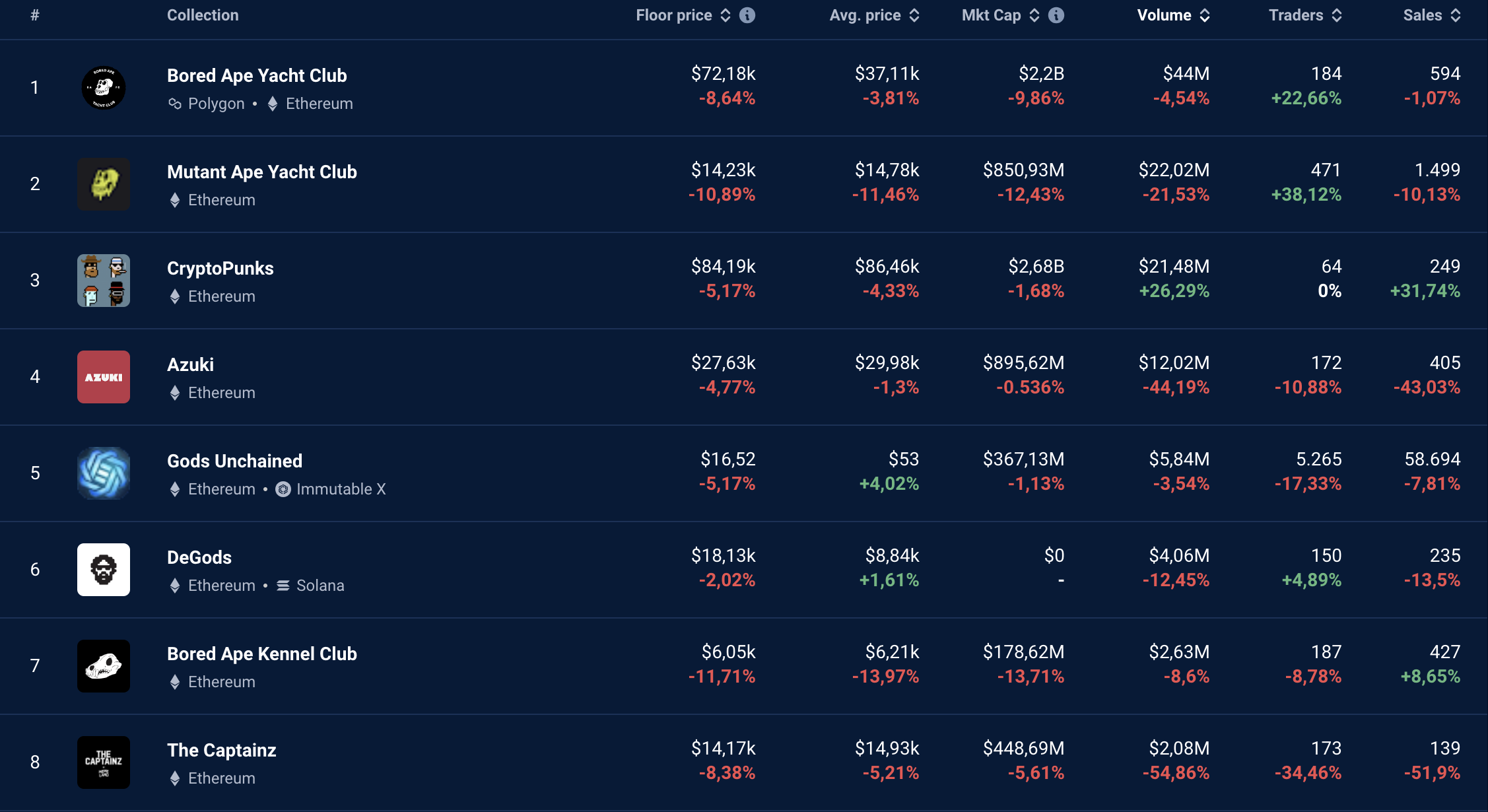 En yüksek organik işlem hacimlerini elinde tutan NFT pazarı OpenSea 2021 Temmuz ayından bu yana elde edilen en düşük seviyeleri gördü. Toplam hacim 1.800 ETH’ye düştü. Platformda en yüksek işlem hacmi sağlayan projeler Bored Ape Yacht Club (BAYC) ve Mutant Ape Yacht Club (MAYC) oldu.