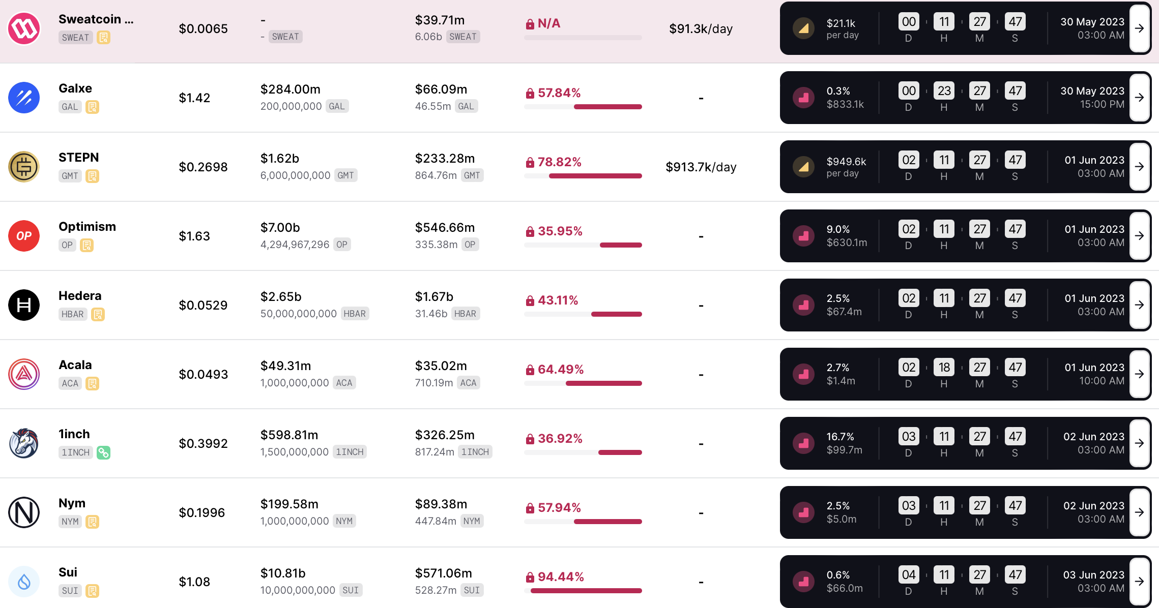Mayıs ayının son haftası itibarıyla Optimism (OP), Sui, 1inch Network (1INCH) ve Trader Joe (JOE) gibi 10 popüler altcoin kilit açacak. SUI arzına, yaklaşık 63,7 milyon dolar değerinde 61 milyon SUI ekleniyor. Trader Joe’nun (JOE) kilit açılımıyla mevcut arzda ufak bir artış görülecek. Ancak, toplam kilitli JOE miktarından geriye yalnızca %2 kalacak olması pozitif görülüyor.