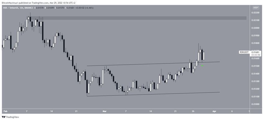Reserve Rights (RSR), SLP’ye benzer şekilde, 24 Şubat’ta yükselen bir paralel kanal içinde hareket etmeye başladı. Ayrıca altcoin, 27 Mart’ta paralel kanaldan çıkış gerçekleştirmeyi başardı. 28 Mart’ta ise paralel kanalın direnç çizgisi bir destek olarak onaylandı (yeşil ok).