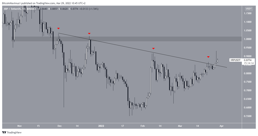 Ripple (XRP) 30 Kasım’da alçalan bir direnç çizgisi altında değer kaybetmeye başladı. Ayrıca altcoin, direnç çizgisinden dört kez reddedildi (kırmızı oklar). Son reddedilme ise 22 Mart’ta gerçekleşti. Ancak reddedilmenin ardından yeni bir yükseliş hareketi başladı. Böylece 25 Mart’ta direnç çizgisi aşıldı.