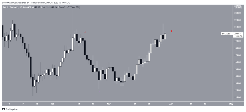 Elrond (EGLD) 22 Ocak’ta yükselişe geçti (yeşil ok). Ayrıca 24 Şubat’ta yüksek bir dip meydana geldi ve yükseliş hareketi devam etti. Böylece altcoin, 28 Mart’ta 214,80 dolar seviyesinde bir tepe oluşturdu.