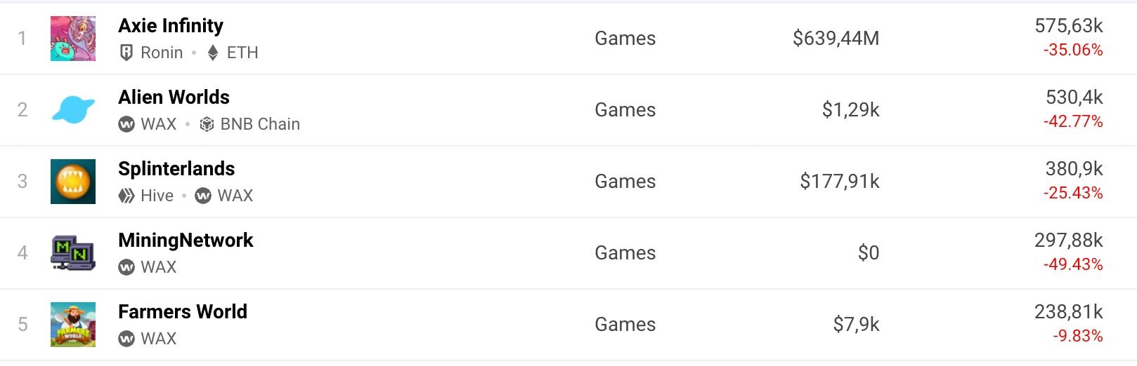 GameFi sektöründe en popüler iki blok zincir ağı bu ay da Ronin ve WAX oldu. En fazla oyuncunun tercih ettiği oyunlar arasında çok sayıda WAX oyunu bulunurken WAX yeni oyunlar çıkarmaya devam ediyor.