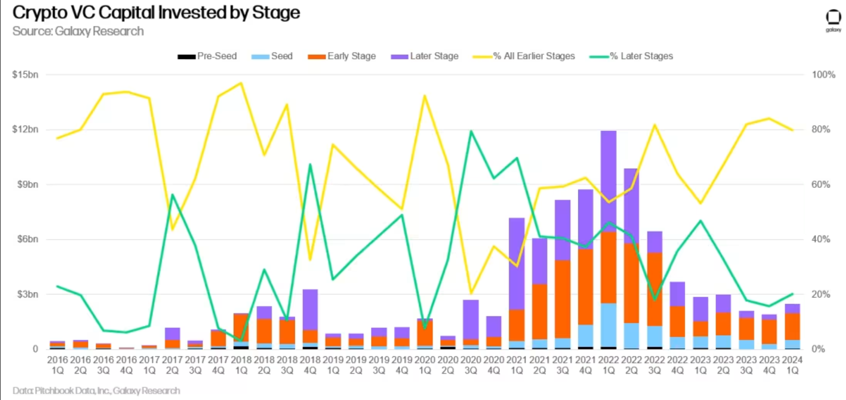 Paradigm’in son hamlesi, risk sermayedarları arasındaki eğilimle uyumlu. Galaxy Digital Research’ün raporuna göre, 2024’ün ilk çeyreğinde sermayenin yaklaşık %80’i erken aşamadaki şirketlere ayrıldı. Kalan %20’lik kısım ise daha sonraki aşamadaki şirketlere layık görüldü.