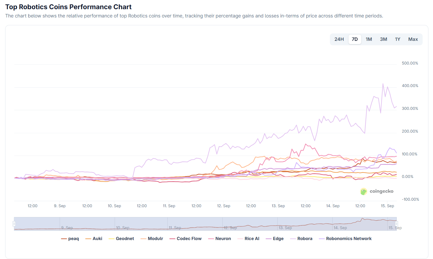 SponsoredGeçtiğimiz hafta boyunca, birçok robotik projesi güçlü kazançlar elde etti. CoinGecko verileri, bu sektördeki çoğu token’ın %70 ile %300 arasında pozitif performans sergilediğini gösteriyor. Buna rağmen, tüm sektörün piyasa değeri 400 milyon Dolar’ın altında kalıyor.