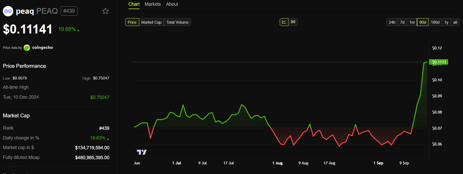 Ekosistem büyümesinin yanı sıra, piyasa verileri yatırımcıların bu Katman 1 altcoin’e olan ilgisinin arttığını gösteriyor. BeInCrypto verilerine göre, PEAQ 90 günlük en yüksek seviyesine 0,11 Dolar’da ulaştı. Eylül ayının başından bu yana fiyatı yaklaşık %90 oranında arttı.