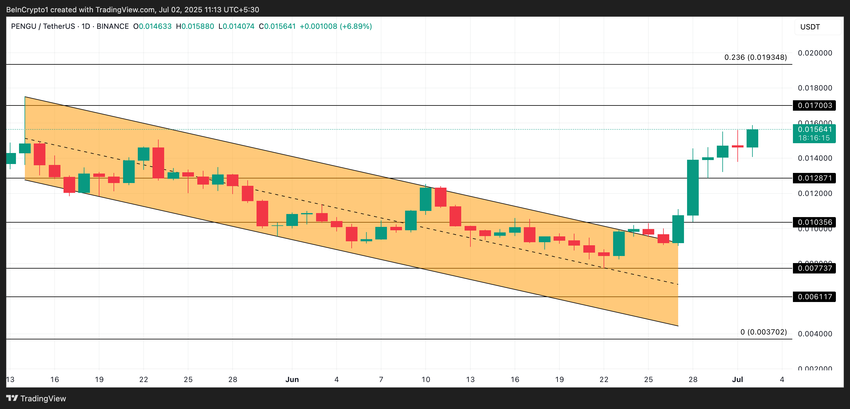 Ancak, 27 Haziran’da PENGU bu kanalın üzerinde kapanış yaparak bir yükseliş başlattığında işler değişti. Şu anda 0,015 Dolar’dan işlem gören meme coin’in fiyatı o zamandan beri %50 arttı.