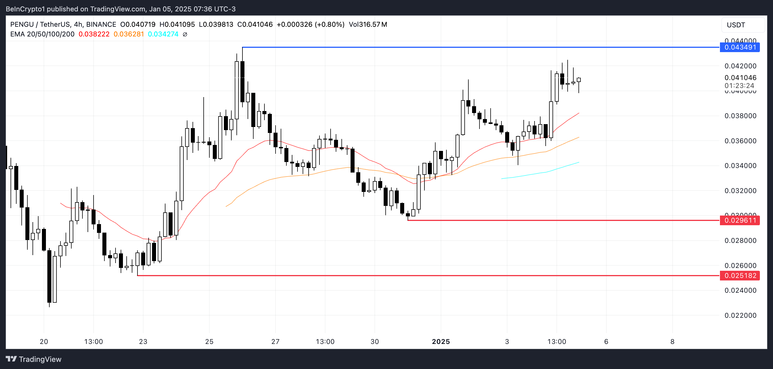 Mevcut yükseliş trendi güçlü kalırsa, PENGU fiyatı yakında 0,043 dolar direncine meydan okuyabilir. Bu seviyenin üzerinde bir kırılma, daha fazla kazanç için yolu açabilir ve coin’in daha önce ulaşmadığı 0,05 dolar hedefiyle, onu en değerli Solana meme coin’leri arasında yapabilir.