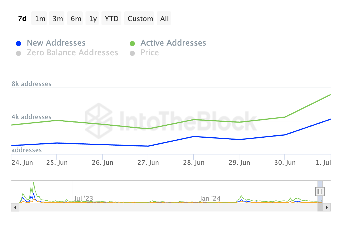 Blockchain tabanlı veriler, PEPE’nin günlük aktif adreslerinin bu dönemde %105 arttığını gösteriyor. Ayrıca, meme coin ticareti yapmak için günlük olarak oluşturulan yeni adreslerin sayısı da %300’den fazla arttı.